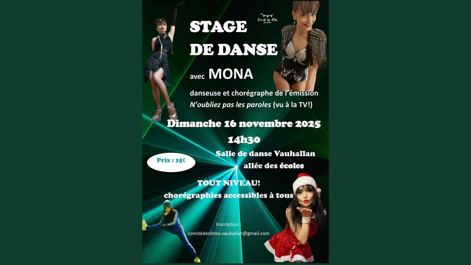 Le Comité des Fêtes de Vauhallan a le plaisir d’accueillir Mona, danseuse et chorégraphe de talent issue de la troupe The Precious Stones. Passionnée, rayonnante et pleine d’énergie, Mona s’est fait connaître du grand public grâce à sa participation à l’émission télévisée N’oubliez pas les paroles aux côtés de Nagui, où elle illumine le plateau par ses chorégraphies dynamiques et sa présence scénique.